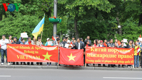 他们从地铁站游行到位于乌克兰首都基辅市的中国大使馆。他们手上高举以越南语、乌克兰语、英语和汉语书写的标语,同时高呼要求中方立刻停止违背国际法和越中两国达成协议的行为等的口号。