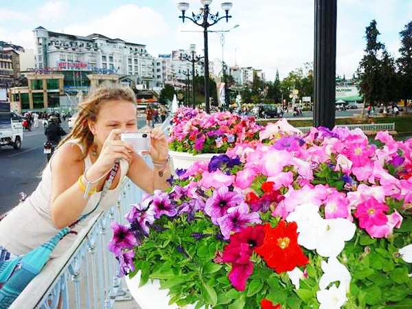 一名外国游客在大叻花卉节拍照