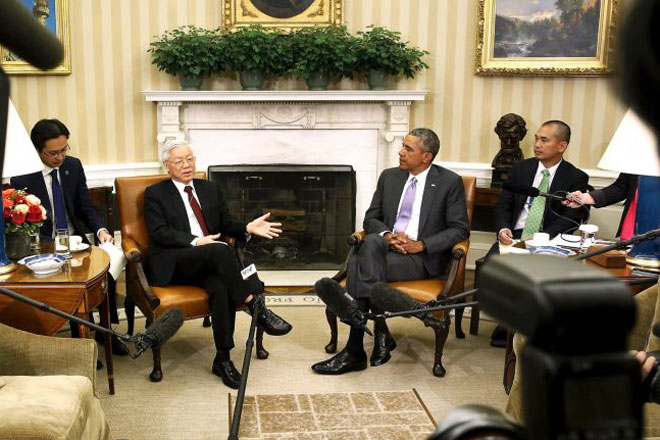 文章强调,阮富仲这次访美是在两国关系正常化20周年及越南战争结束、国家统一40周年之际进行的。此行具有特殊象征意义,因为,越南共产党最高领导人首次对美国进行正式访问。