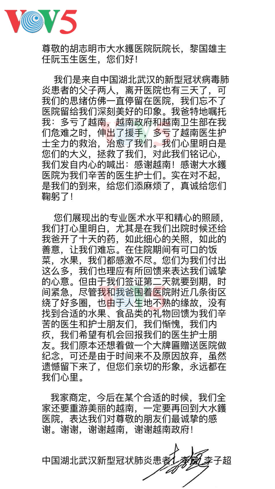 中国新冠肺炎患者向越南致感谢信