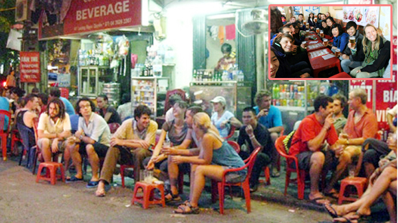 暑夏在河内谢现和良玉绢街边喝啤酒:外国游客的乐趣