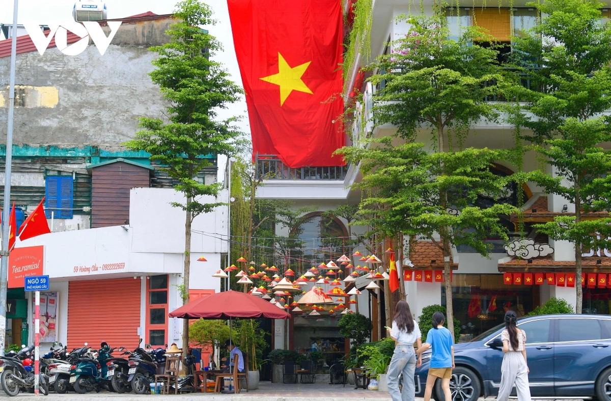 金星红旗在河内的秋风中飘扬,连接着每个屋顶、每条街道,如同一张鲜活而庄严的红毯。不仅国家机关单位和办公室,每户人家、商店和咖啡馆都装饰一新,营造出充满节日气氛的城市空间。许多装饰还将旗帜与灯光巧妙结合,成为独特的“打卡点”,吸引了大批市民和游客。
