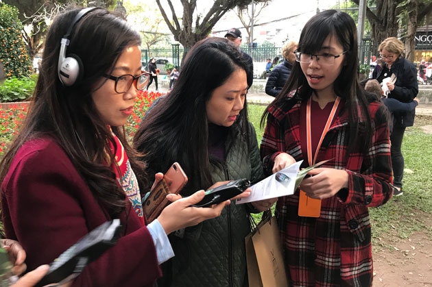 越南游客裴黄江表示:“该设备十分先进。它不仅介绍文庙国子监的所有景点,还介绍这里的历史。更特别的是,听着导览内容,我为越南民族,为这一国际级遗迹区而倍感骄傲”。