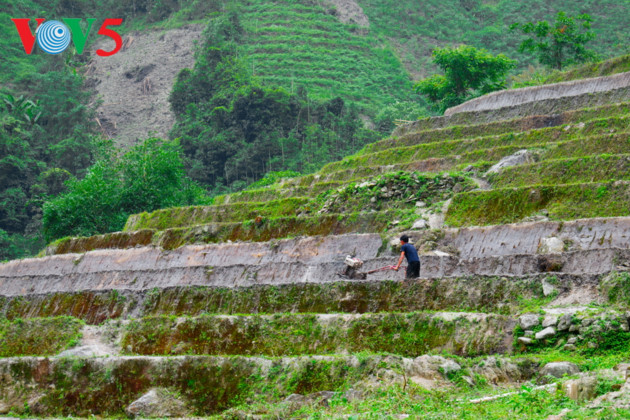 (VOVWORLD) - 5月份,河江梯田准备进入插秧季节。人们在梯田、山坡上开始驳岸、断流、耕地。