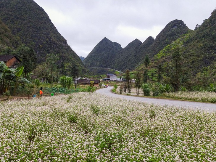 同文岩石高原一年四季各有其美,特别是二月底三月初的春天,野桃花、梨花、李花绽放的粉红色和白色,古老土坯房的土黄色,长满青苔屋顶的深绿色,用一块块岩石堆成的围栏的灰色,一切让人觉得,似乎有一双手在随性配色,绘出一幅岩石高原完美的全景画。图片来源:《越南之声》。