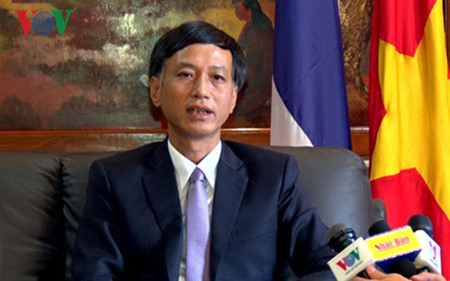 | 越南驻泰国大使馆代表在记者会上发言 |