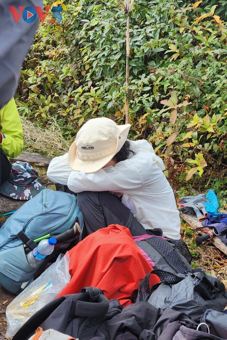 | 大雾和湿滑的路让徒步旅行者暂时停下脚步,扎营休息,等雾散后继续爬山。 |