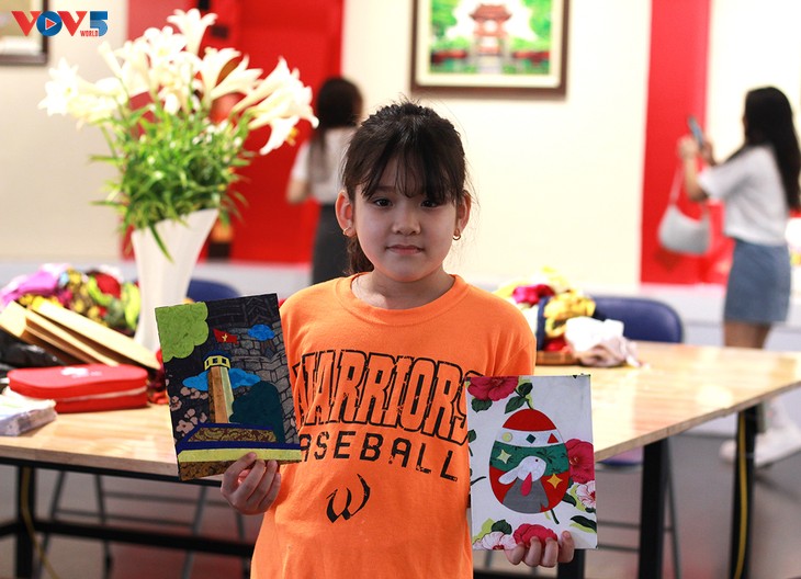 河内市西湖郡小学三年级学生黄燕装高高兴兴地介绍她在体验活动中亲手制作的产品。 |