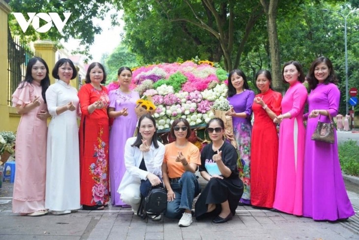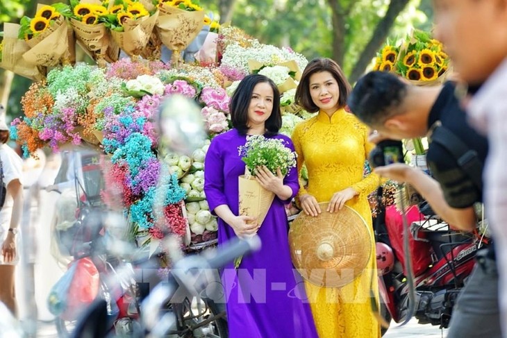 穿着优雅的奥黛走在街上不仅能留住美好的瞬间,还有助于保护和传播越南文化遗产——传统奥黛的精髓和美丽。图片来源:越南之声交通频道,摄影:海鹏。 |
