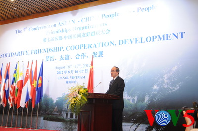 (VOVworld)- 适值东盟成立45周年、东盟中国建立对话关系21周年,第七届东盟-中国民间友好组织大会16日在河内隆重举行。越南政府副总理阮善仁、中国-东盟协会会长顾秀莲、东盟十国民间组织一百多名代表出席开幕式。