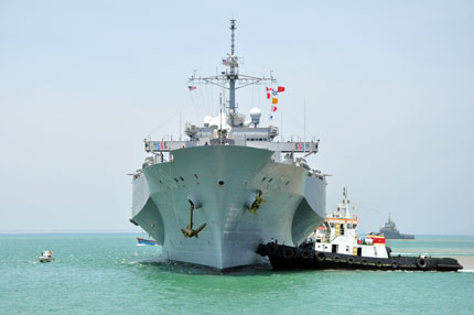 舰上有多名美军官兵、教练员、后勤人员和军医、流动潜水和救护队队员,以及美国海军第七舰队东方快车乐团。