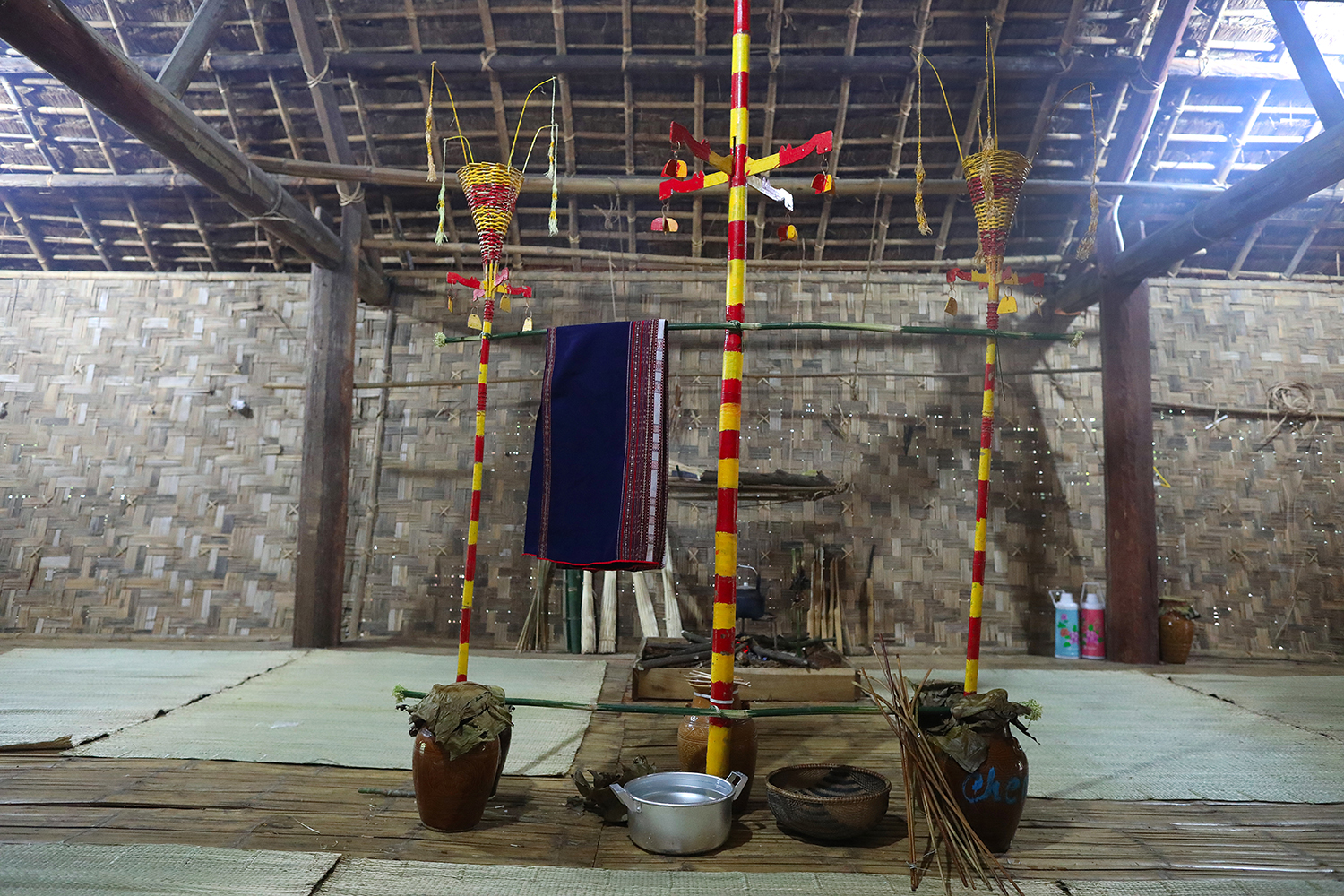 “ 这根竹幡被称为供桌幡,竹苗小巧,放在供桌旁方便看到和铭记。它是用来邀请神灵和祖先共同见证仪式的”。越南各民族文化旅游村的巴拿族组长丁波里说。