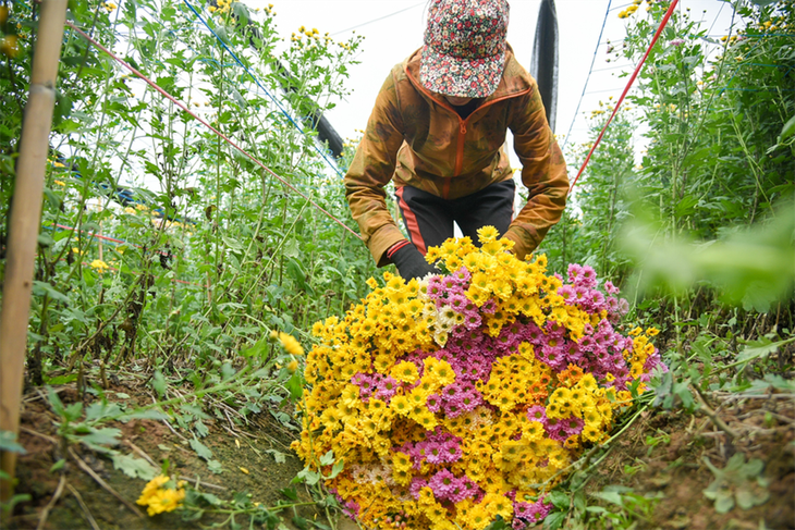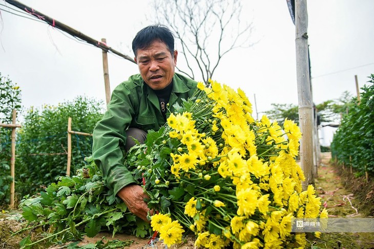 菊花捆成束,放在路边,等小商贩来收购。除了河内市外,西就花村的花还跟着商贩销往北部各省。图片来源:VTC 。(完) |