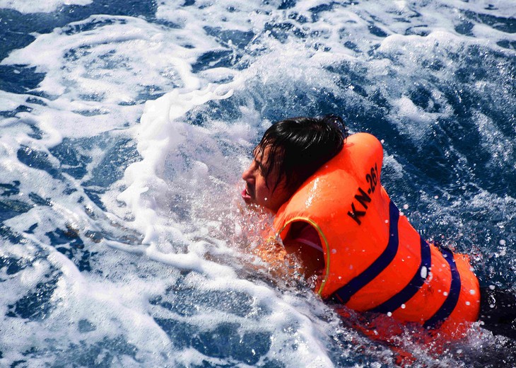 由于风浪大和天气恶劣,DK1 / 20号高脚屋指挥长阮文林中校无法登上高脚屋执行任务。所以,他就穿上救生衣,拿着绳子跳入大海,让高脚屋上的战士拉他上来。