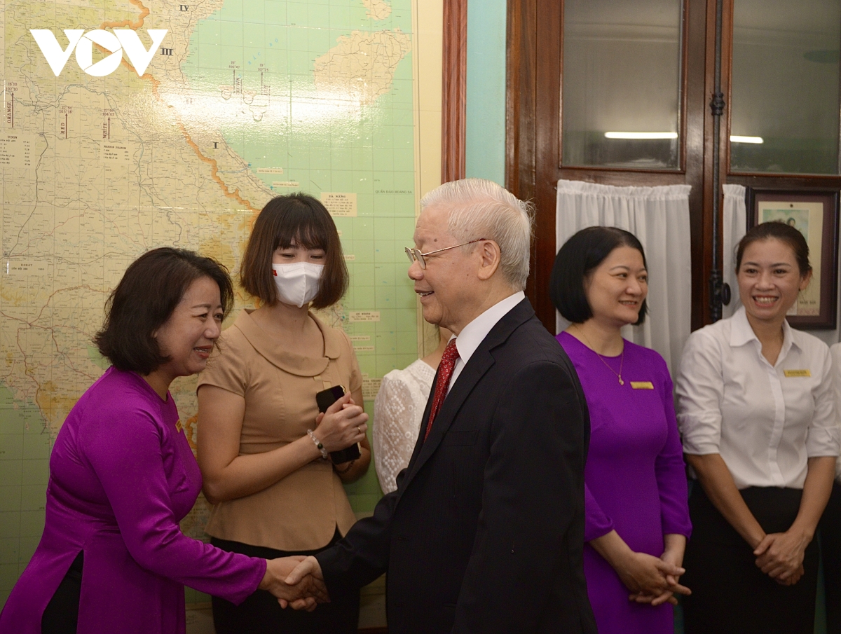 阮富仲在这里与遗迹区管委会干部、人员交谈时要求他们继续集中研究胡志明思想、道德、作风,将其介绍给全国同胞及国际友人,使之更了解他老人家的思想、道德、作风。阮富仲强调,胡志明思想、道德、作风是越南共产党乃至越南民族的无价之宝,是照亮革命道路,引领越南革命从胜利走向胜利的火炬。学习和践行胡志明思想、道德、作风是全党、全民必要、重要、经常性且不可或缺的工作和任务。