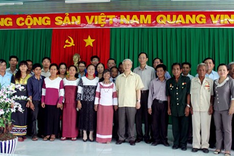 越共中央总书记阮富仲与宁顺省博爱县福大乡干部和乡民合影 |