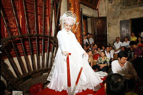 三府圣母祭祀信仰是在女神崇拜基础上发展起来的对化为天、山、水、森林母亲的女神的一种祭祀形式。三府圣母祭祀信仰的祭拜仪式包括祭祀、跳神、唱朝文歌、庙会,其中较具代表性的是南定省耶府庙会和其他庙会。该信仰体现在各项传统文化要素上,如服装、音乐、舞蹈、演唱等,带有浓郁越南文化色彩,数百年来一直得到一代代越南人创新、发展和流传。