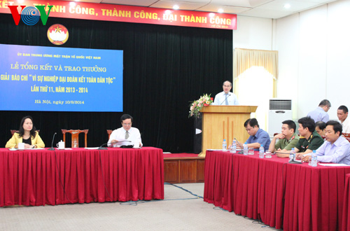 (VOVworld)-由越南祖国阵线中央委员会举办的2013-2014年第11次“为了民族大团结事业”新闻奖总结会暨颁奖仪式9月10日在河内举行。