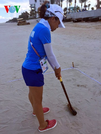 在山水海滩举行的沙滩木球女子单打决赛中,越南运动员潘氏凤以3比0战胜队友阮玄庄为越南代表团赢得了首枚金牌。随后,越南运动员同时在沙滩克拉术和沙滩柔术等两个项目中获得3枚金牌。