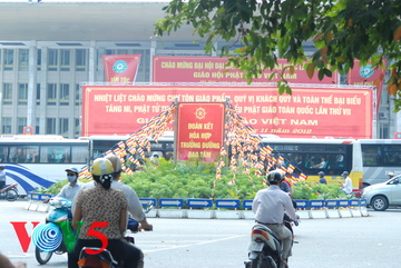 (VOVworld)- 如本台曾报道的,越南佛教教会第7次全国代表大会23日在河内隆重举行。值此之际,河内大街、寺庙处处是彩旗、莲花灯,迎接全国各地的与会代表。今天的镜头中的越南,就介绍这次大会的盛况:
