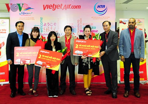 岘港市旅游部门迎接2018年从韩国飞往岘港国际机场的第一个航班。这是越捷航空公司的直达航班,从韩国起飞并于1月1日9时20分抵达岘港国际机场,搭载200名游客。