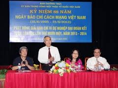祖国阵线中央委员会主席黄担出席仪式并发表讲话。他表示,88年来,越南革命新闻业不断发展壮大、全方位成长,在抗战、争取独立、国家建设、革新事业中与民族同行;在全民族大团结事业中与祖国阵线密切配合。