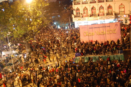 (VOV World) 越南各地群众在热闹喜庆的气氛中迎接壬辰春节。22日晚,越南北部山罗省山罗市各族同胞涌上街头共度除夕。在山罗市白桥十字路口,数千人等着观看新年烟花表演。山罗市民阮明贤表示:“我每年都带家里的小孩到这里看烟花,气氛非常好。我希望新年给大家带来更多美好的希望。”