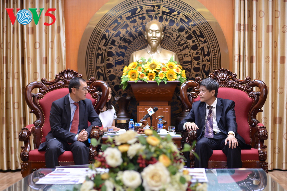 会见时,武海概括介绍了本台情况。武海表示,越南之声现与国际和地区64个广播电视台和组织建立了关系。特别是,本台十分积极参与亚太广播联盟(ABU)、亚太广播发展机构(AIBD)等的活动。每年,本台都与国际伙伴进行广播电视节目交换。