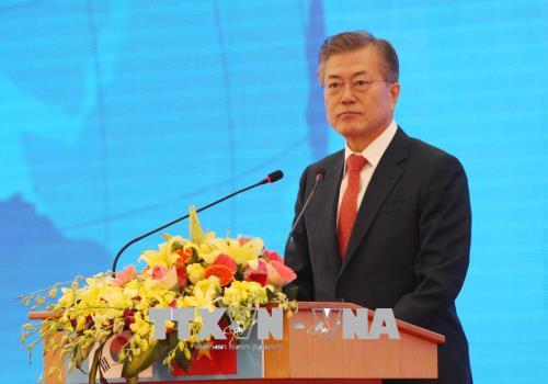 文在寅对能访问友好、好客的越南表示高兴,并对陈大光的热情接待表示感谢。他说 :“越南是韩国的重要伙伴,韩国也是越南的重点伙伴。在韩国正在实施的新南向政策中,越南占有重要地位。在今天的元首会晤中,两国展现了深厚友谊,并一致同意为两国民族的繁荣努力推动合作”。