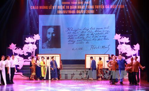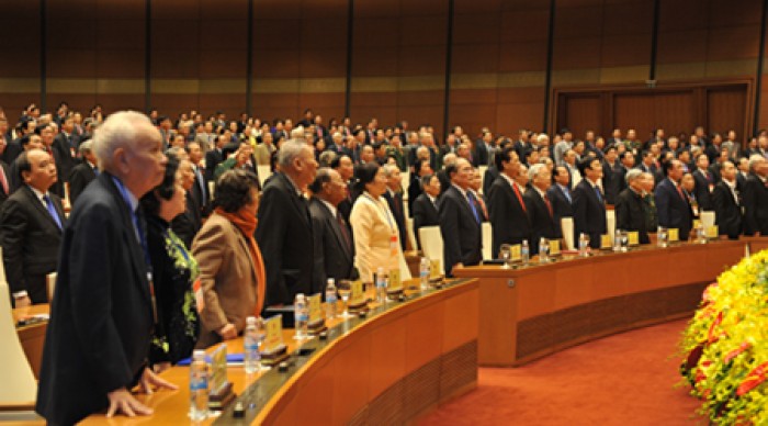 (VOVworld)- 越南国会第一次全国普选70周年纪念大会1月6日在国会大厦举行。越共中央总书记阮富仲、国家主席张晋创、政府总理阮晋勇、国会主席阮生雄、祖国阵线中央委员会主席阮善仁同历届党、国家、政府和国会领导人出席大会。