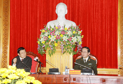 (VOVworld)- 越南国家主席、“继续革新、完善从中央到基层的政治体系”提案制定指导委员会主席张晋创1月3日与中央公安党委举行座谈。其目的是检查公安部门落实越共十届四中全会关于“革新、健全党务机关组织机构,革新、健全国家、祖国阵线和政治社会团体组织工作方向”决议;越共九届五中全会关于“革新和提高乡、坊、镇的基层政治体系质量”决议;以及“继续革新、完善从中央到基层政治体系”提案制定计划等的情况。