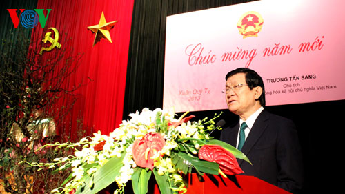 在辞旧迎新的神圣时刻和喜迎2013癸巳年新春的欢乐气氛中,我谨向全国同胞、同志、全军指战员以及海外越南人致以最美好的新春祝福。我谨代表越南人民向世界各国人民致以和平、友好、合作与发展的祝愿。我并代表越南国家及人民向世界各民族致以新年的和平、友好、合作与发展祝愿。