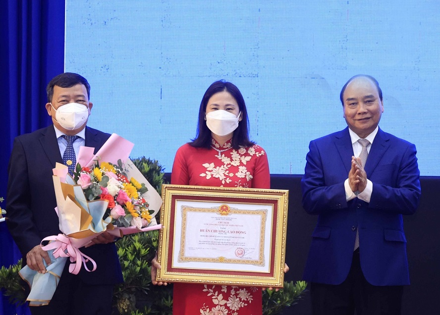 越南国家主席阮春福4月12日上午在胡志明市古芝县向古芝县党委、政府和人民颁发三级劳动奖章,以表彰其在防疫领域取得的突出成绩。
