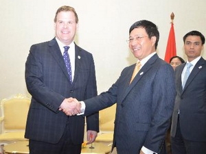 (VOVworld)-东盟加一外长会议11日在柬埔寨金边举行。澳大利亚、加拿大、中国、欧盟、印度、日本、新西兰、韩国、俄罗斯和美国等东盟10个对话伙伴官员参会。越南外长范平明率团赴会。范平明在会上建议东盟与伙伴国继续有效按期开展各项现有合作项目,大力推动经贸、投资、人力发展、信息技术、科技合作,应对各种突出挑战和非传统安全挑战。范平明建议,伙伴方继续支持并为建设东盟共同体,加强地区互联互通,缩短发展差距,发展湄公河次区域等作出具体贡献,支持东盟在东盟加一、东盟加三、亚洲峰会、东盟地区论坛、东盟部长扩大会议等地区论坛中发挥中心作用。