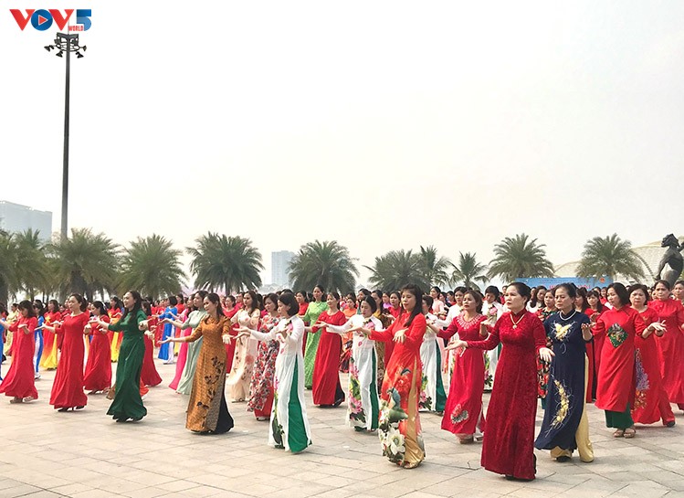 河内市嘉林县妇女参加传统奥黛表演 |