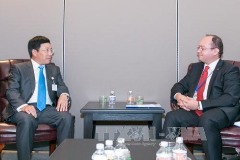 (VOV)- 据本台记者黄勇报道,越南高级代表团出席在美国纽约举行的联合国峰会期间,越南政府副总理兼外交部长范平明于当地时间9月27日分别会见了保加利亚外长、丹麦外交大臣和喀麦隆对外关系部长。