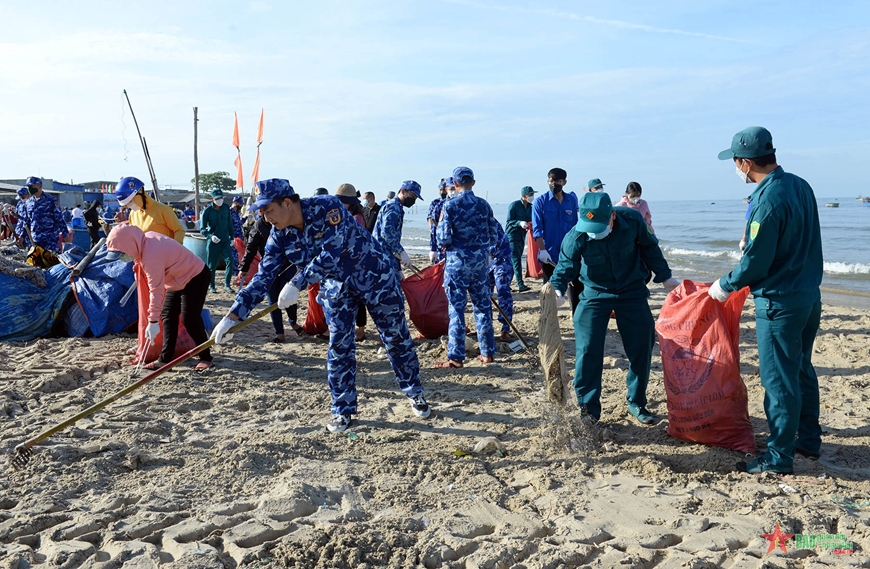 越南海上警察同李山岛县居民在海滩上收拾垃圾。 |