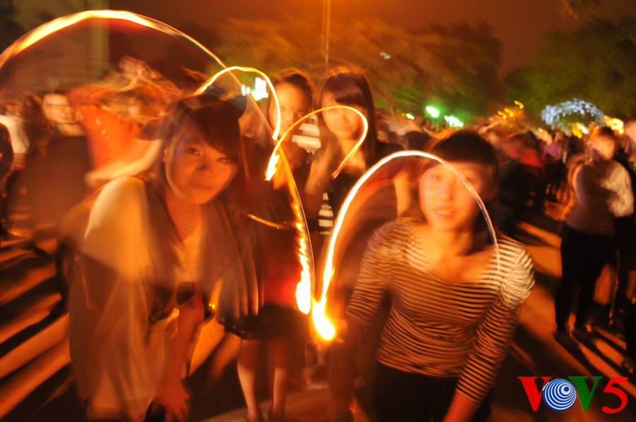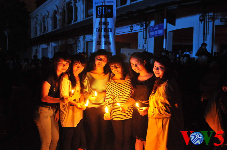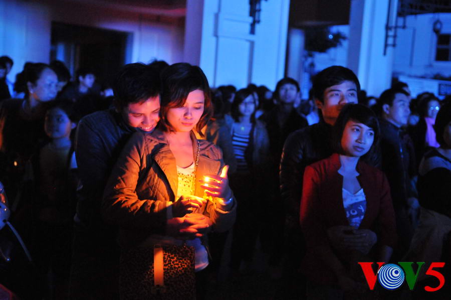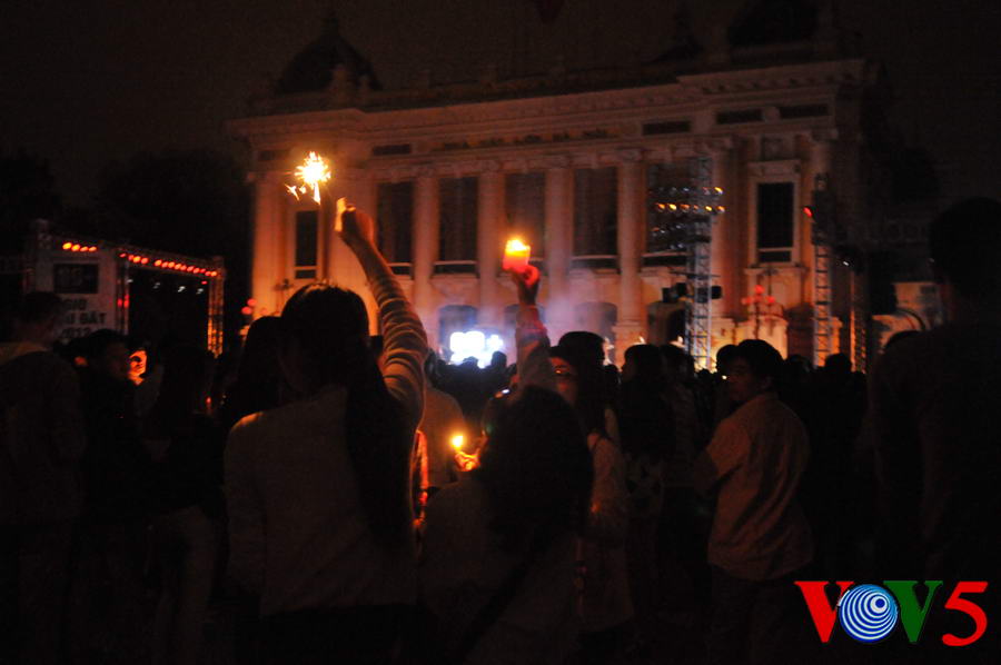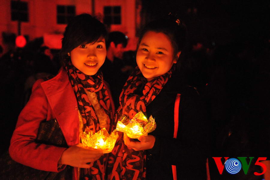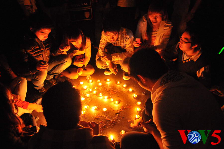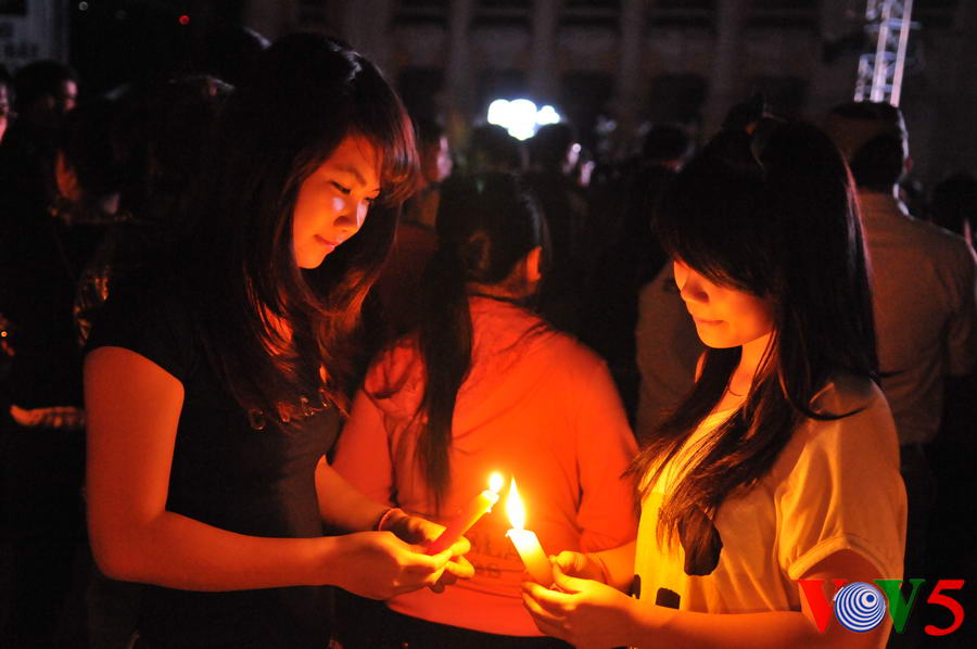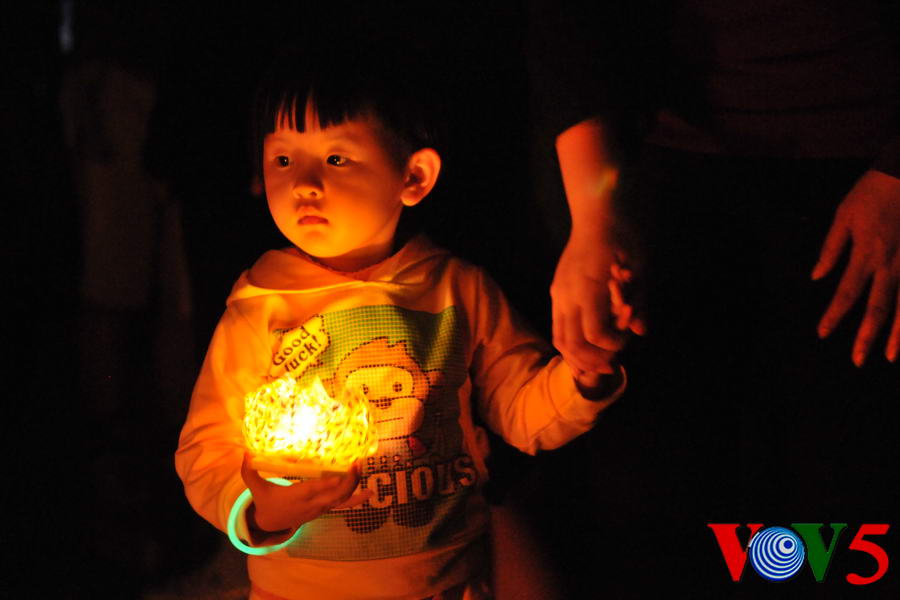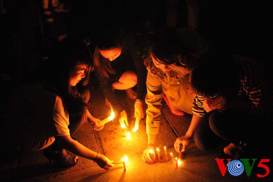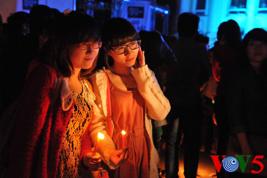 | 20时30分,广场灯光全部熄灭,人们点起蜡烛 |