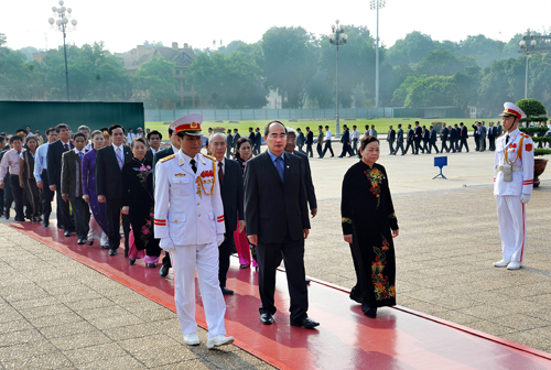 越共中央总书记阮富仲、国家主席张晋创、政府总理阮晋勇、国会主席阮生雄、原越南党和国家领导人,以及外国驻越外交使团、知识界、各阶层人民、武装力量、各团体、各宗教、越南英雄母亲、旅外越南人等的一千多名代表参会。