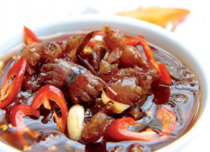 一位特别喜欢“酱”的主妇芳华说:“除了一些用鲜鱼为主要原料的酱外,还有一些用虾、小虾、螃蟹、海虫等为主原料的酱。谈到虾子酱,就会想到河内一种很特殊的菜,虾子酱炸豆腐米粉。而到了承天顺化省,又有一种虾酱,这种酸辣整虾酱,是用生虾去头加入盐、辣椒、下圆白茄子等做成,味道很不错。在越南南部酱类更多,比如同塔省的鱼内脏酱、坚江省的章鱼酱、金瓯省的江螃蟹酱、龙安省的小海蟹酱等等。”