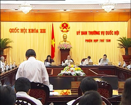 (VOVworld)- 越南13届国会常务委员会8次会议本月4日和5日在河内举行。国会主席阮生雄主持会议。出席会议的有民族委员会常委会和国会各个专门委员会代表、中央一些部委、机关和相关组织代表。国会常委会就一些新项目和增资项目提出意见,基本同意政府关于将4个新项目和宁顺省沿海公路项目所属的5个小项目纳入2012至2015年使用政府债券资金工程项目名单。国会常委会同意政府关于向北部、中部和西原地区山区省份19个大型水利项目提供5.5万亿越盾政府债券资金的方案,向2012至2015年国家目标计划项目的目标、任务、实施期及人员和资金安排等提出意见。国会常委会也基本同意2011年中央财政支出余额和中央财政超收收入安排方案,建议调整用于改善革命有功者住房条件的财政支出。会上,国会常委会继续向13届国会3次会议的筹备工作,革新、提高国会活动质量和效果提案提出意见,通过关于实施革命有功者法律政策决议并讨论人事安排问题。