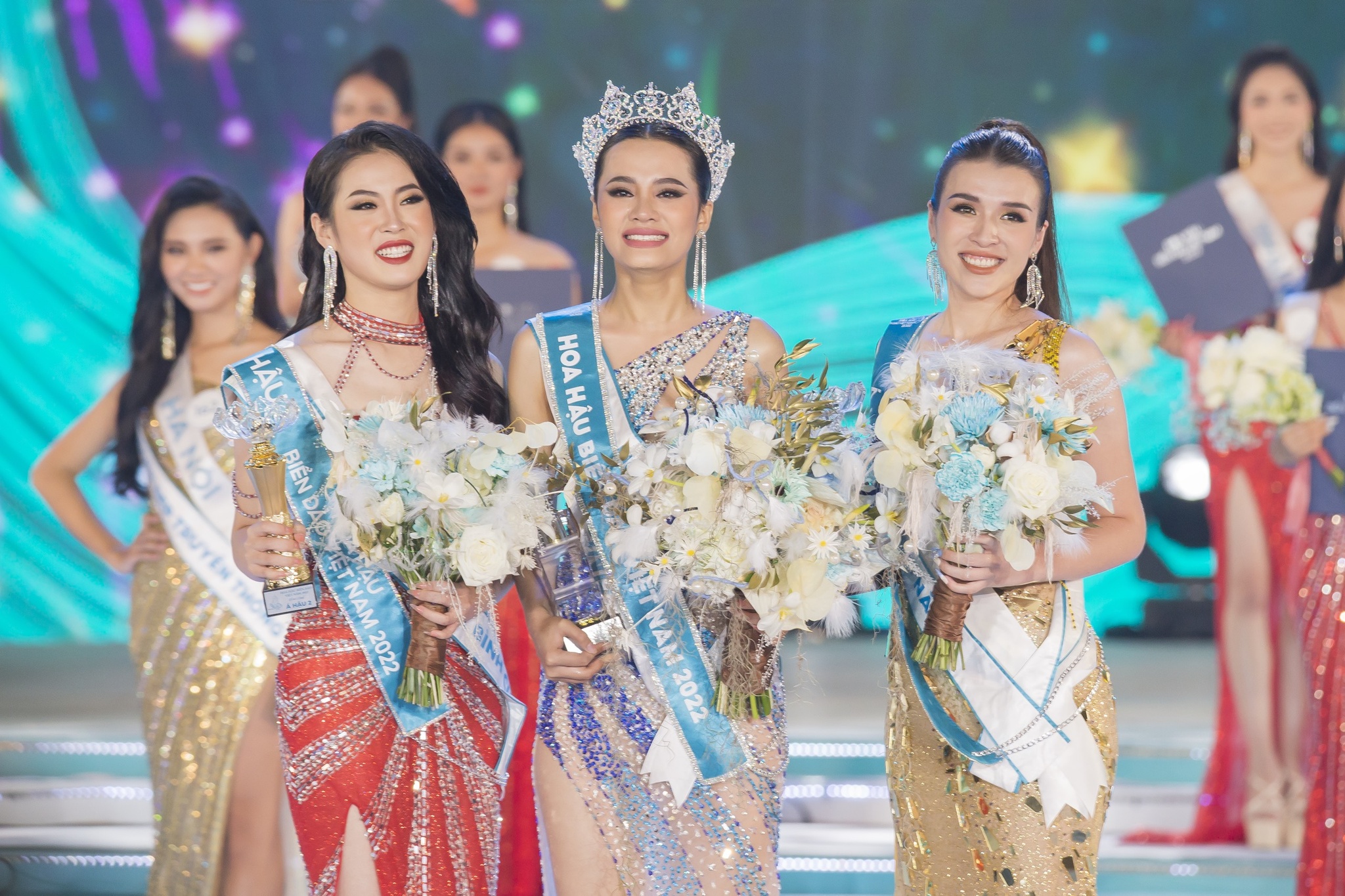 2022年越南海洋岛屿选美大赛冠军丁如芳(中)与亚军和季军合影。