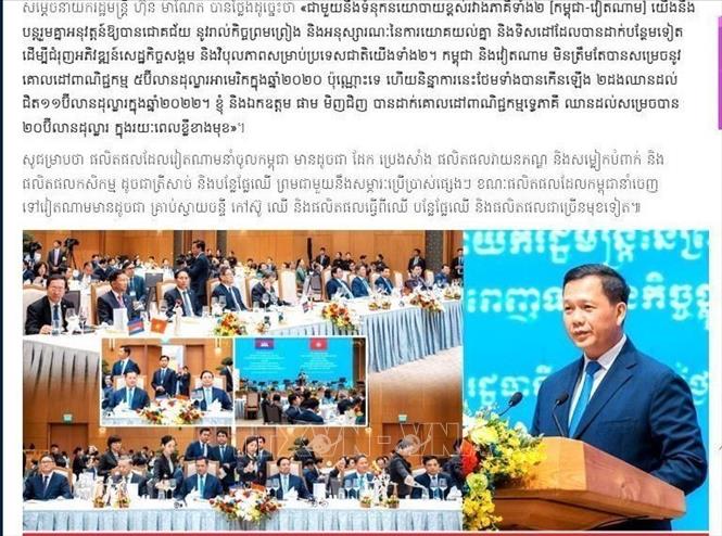 "两国政治关系走向深入,并被视为合作关系定向的基础,巩固国防安全的合作,在对外工作中紧密配合,提高经济,文化,教育,科技等领域的合作效率。双方签署了多项合作文件,特别是涉及连接两个经济体,以及区域一体化领域。人文交流日益发展,且活动丰富多样,切实有效,有越来越多的柬埔寨青年学生到越南学习"。黎明凯说。