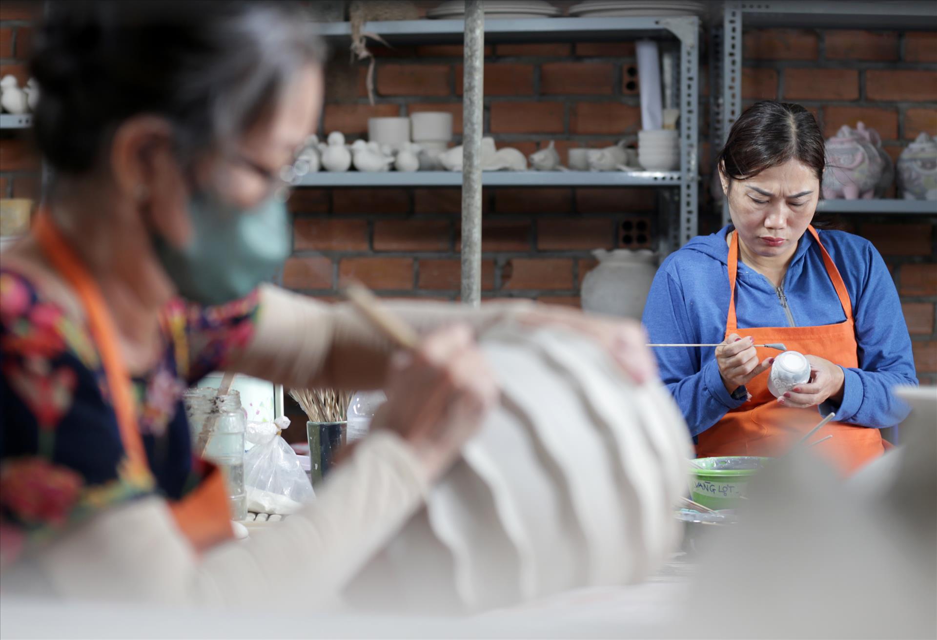 梅玉儿是同奈省边和丰山 陶窑的老板,她家 5 代从事陶瓷生产。每天,丰山古陶窑都会开门,接待大批游客前来参观、了解边和古陶瓷。梅玉儿说: “边和陶瓷采用手绘,每件产品都具有独特的美感,因此受到顾客的喜爱。手工艺陶瓷制品制作精良。与工业陶瓷相比,我还是更喜欢手工制作的陶瓷品。”