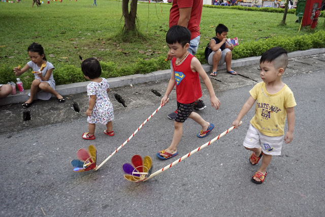 在升龙皇城清凉宽阔的空间中,孩子们观看祭哨村木偶艺人表演的木偶戏和朝曲村艺人表演的舞狮等。活动上还再现挑稻过竹桥、拔河、捉迷藏、蒙眼打鼓、跳麻袋等民间游戏。此外,孩子们还有机会观看艺人制作各种传统玩具。期间,艺人们还教孩子们做法,让他们边学边玩,自己动手,如做面具、五角星灯、兔子灯、纸进士等等。