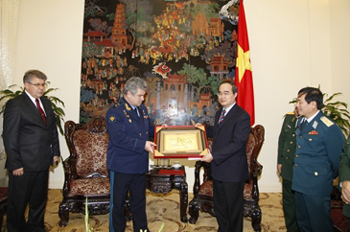 (VOVworld)-越南政府副总理阮善仁12月28日在政府总部会见了正访越并出席“河内空中奠边府大捷”40周年纪念活动的俄罗斯空军总司令维克托邦德利中将和中国人民解放军空军副参谋长王义生少将。