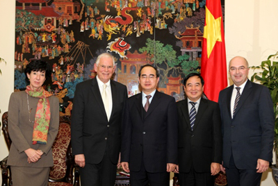 (VOV)- 越南政府副总理阮善仁十四日下午在河内会见了奥地利克雷姆斯高等专业学院董事会主席博耶·海因茨。会上,阮善仁对越奥教育合作,特别是越南商贸大学与奥地利克雷姆斯高等专业学院的校际合作给予高度评价。越方希望奥方继续传援现代教学技术,奥方大学继续在越南实施教育项目。阮善仁对该校提出的合作倡议表示欢迎,并表示相信该倡议将尽快成为现实,提高两国教育合作的效果。