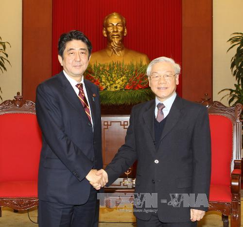 当天下午,越共中央总书记阮富仲在党中央总部会见来访的日本首相安倍晋三。阮富仲重申了越南党和国家重视并希望不断发展越日友好与战略伙伴关系的一贯政策,为两国人民造福,促进世界和地区和平、稳定和繁荣。他并建议,日方在越南重组经济结构、转换增长模式方面与越方加强合作。