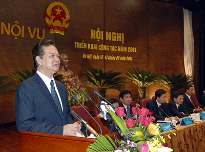 越南内务部14日在河内召开会议,部署今年工作和2011-2020年阶段行政改革总体计划。去年,内务部良好组织了13届国会代表和2011-2016年任期各级人民议会代表选举,协助政府制定并呈交13届国会通过了13届政府组织机构方案,对2001-2010年阶段国家行政改革总体计划执行情况进行总结,并协助政府制定颁行2011-2020年阶段国家行政改革总体计划。政府总理阮晋勇出席会议并发表讲话。阮晋勇表示,内务部要集中指导、有效实施2011-2020年阶段国家行政改革总体计划。这是越共11大确定的三个突破口之一,因此要集中解决存在问题,建设中央到基层运行畅顺的行政体系。阮晋勇要求内务部继续加大公务员制度和工资改革力度,尽快制定部门、地方行政改革绩效评估标准并向社会公开,方便人民监督、评价实施效果。(完)