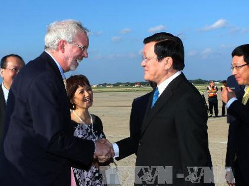 阮国强强调:“自建立全面伙伴关系后,越美关系在多个领域,从政治、外交,到安全、科技、教育等,都取得了快速发展。经贸领域,两国正同其他10国进行谈判,以及早签署“跨太平洋伙伴关系协定”。两国贸易也迅速发展。科技领域,美国国务卿克里和越南外交部长范平明不久前草签了123协定,揭开了越美在民用核能领域开展更多合作的新前景。”